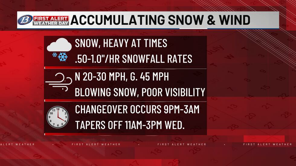 EAU CLAIRE, Wis. (WEAU) – A powerful, late winter storm will continue to track to the south of Wisconsin, wrapping bands of precipitation northward through the state through much of Wednesday morning. We are seeing a steady transition across Western Wisconsin, and that will continue overnight as colder air arrives from the northwest. Snow will stick to non-paved surfaces initially, but it won’t take very long before roads become snow covered and slippery. By morning, temperatures will be at or below freezing for most of our area. The other factor will be the increasing north winds over 20 mph, with gusts possibly up to 45 mph into Wednesday morning. A First Alert weather day will be in effect through Wednesday afternoon for these conditions and the significant impacts to travel.