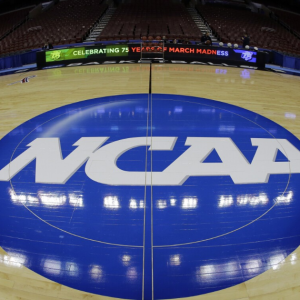 In this March 21, 2013, file photo, taken with a fisheye lens, the NCAA logo is displayed on the court during the NCAA college basketball tournament in Philadelphia. College basketball…