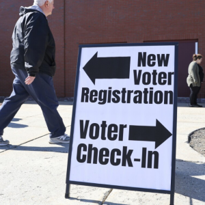 Follow the latest news from President Donald Trump and his administration | March 26, 2025 A sign for new voter registration is seen outside a polling location at Pinkerton Academy…