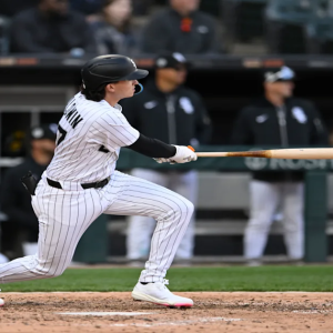 1 / 6 Chicago White Sox’s Brooks Baldwin watches his walkoff single to defeat the Boston Red Sox in a baseball game Saturday, April 12, 2025, in Chicago. (AP Photo/Paul…