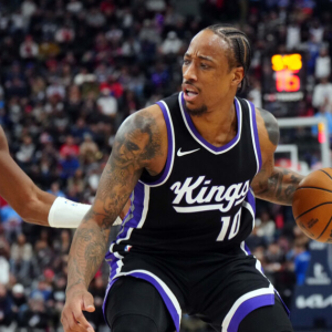 Mar 9, 2025; Inglewood, California, USA; Sacramento Kings forward DeMar DeRozan (10) dribbles the ball against LA Clippers guard Kris Dunn (8) in the second half at Intuit Dome. Mandatory…
