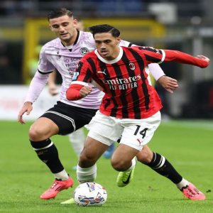 MILAN, ITALY – OCTOBER 19: Tijjani Reijnders of AC Milan competes for the ball with Axel Guessand of Udinese Calcio during the Serie A match between AC Milan and Udinese…
