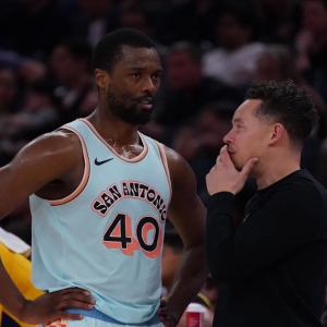 Apr 9, 2025; San Francisco, California, USA; San Antonio Spurs forward Harrison Barnes (40) talks with interim head coach Mitch Johnson in the fourth quarter against the Golden State Warriors…