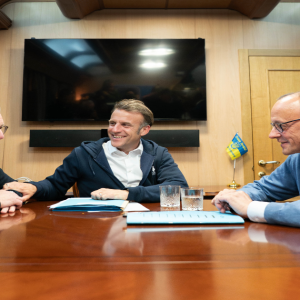 UNSPECIFIED – MAY 9: (L-R) Prime Minister Sir Keir Starmer meets with French President Emmanuel Macron and German Chancellor Friedrich Merz onboard a train to the Ukrainian capital Kyiv where…