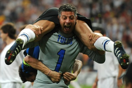 Inter players Francesco Toldo and Javier Zanetti celebrate after beating Bayern Munich in the Champions League final in 2010. Photograph: Christophe Simon/AFP/Getty Images