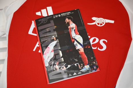 Pictured celebrating the second free-kick he scored against Real Madrid, Declan Rice is the cover star of today’s match programme. Photograph: Stuart MacFarlane/Arsenal FC/Getty Images
