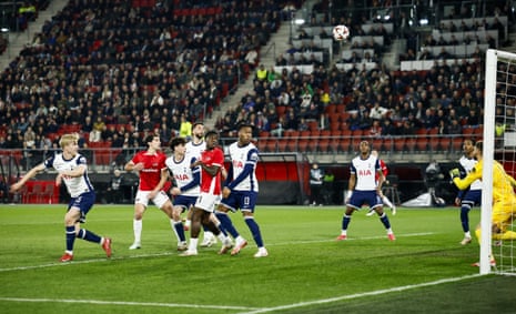 AZ v Tottenham: Møller Wolfe’s bouncing cross evades every defender except Parrot but he can’t quite connect to get the ball on target.