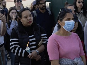 - People listen from outside St. MaryÕs Parish during afternoon mass that was at capacity, in Vancouver, on Sunday, April 27, 2025. Shock and grief rippled through Canada’s Filipino community on Sunday as members struggled to come to grips with an attack at a cultural street festival in Vancouver on Saturday that killed 11 people and injured dozens more.Photo by DARRYL DYCK /THE CANADIAN PRESS
