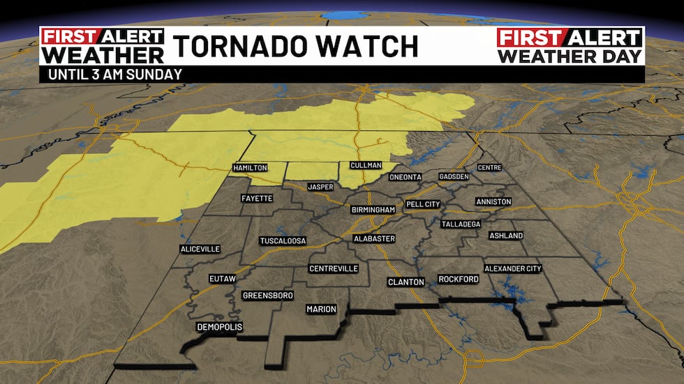 The tornado threat remains low in this setup but not zero. The greatest risk will be to the northwest overnight but shift to the south and east by the late morning and afternoon hours on Sunday. For now, a Tornado Watch is in effect for Marion, Winston, and Cullman Counties until 3 a.m. CDT Sunday. Not everyone is guaranteed to see severe weather; most of us will end up with rounds of steady to heavy rainfall and gusty winds up to 30-40 mph. A Flood Watch is in effect from 9 p.m. CDT tonight through 7 a.m. CDT Monday. A widespread 2-3 inches of rain could fall across our area with isolated higher amounts of 4-5 inches possible.