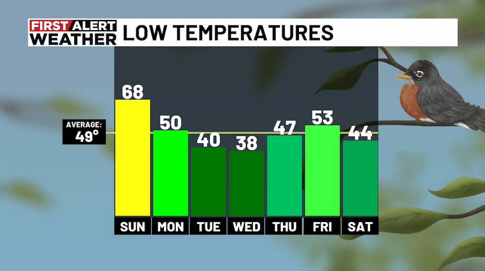 Frost possible next week: Models continue to show morning temperatures dropping below average Tuesday and Wednesday morning. We could see temperatures drop into the lower 40s Tuesday morning. Tuesday will end up sunny and cool with highs in the mid 60s. The coldest morning this week may occur on Wednesday. A few models are hinting at temperatures cooling into the mid to upper 30s. If this happens, we may see some patchy frost for areas along and north of I-20. You may consider covering or bringing any sensitive plants indoors. The good news next week is the weather pattern will end up dry and nice. We’ll likely see plenty of sunshine next week with highs in the 70s next Wednesday through the following weekend. A small chance of rain will be possible next Thursday night into Friday morning.
