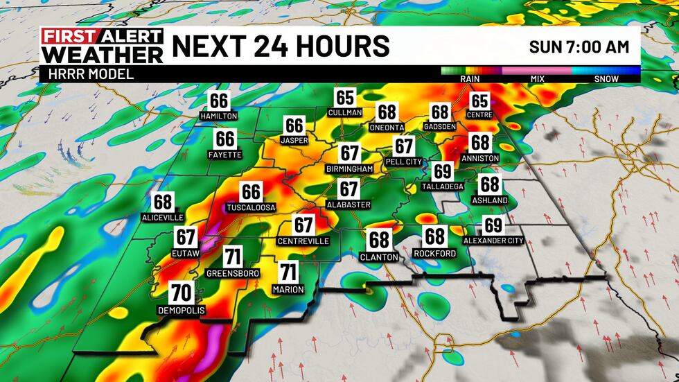 BIRMINGHAM, Ala. (WBRC) – A First Alert Weather Day is in place for Sunday with a flooding and severe risk possible as a line of storms moves in after midnight. These storms will push to the southeast and impact all of Central Alabama Sunday morning with rain lingering through the afternoon and evening hours. We think the greatest window for strong and severe storms will likely occur between 12 a.m. CDT – 2 p.m. CDT Sunday. The main threats will be damaging wind gusts and large hail.