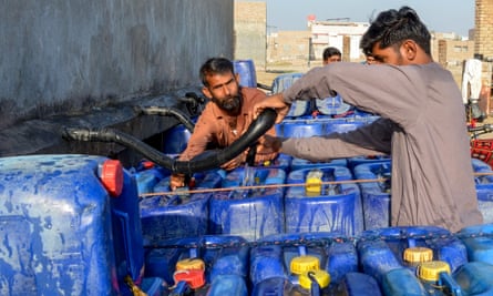 Vendors fill cans with drinking water from a private water supply plant in Jacobabad, Pakistan, one of the world’s hottest cities. The plant is part of a USAid project placed in doubt by Trump’s cuts. Photograph: Fida Hussain/AFP/Getty Images