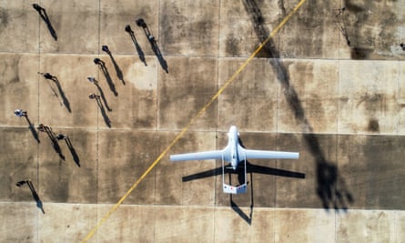 The Bayraktar TB2, built by the Turkish defense and aviation company Baykar, on the tarmac at Geçitkale airport in northern Cyprus. Photograph: Anadolu Agency/Getty Images
