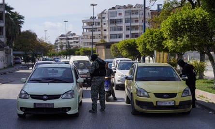 Members of Syrian security forces check cars in the city of Latakia on Sunday. The clashes have resulted in the country’s highest death toll since 2011. Photograph: Karam Al-Masri/Reuters