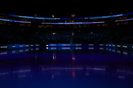 Names of the victims of the 29 January plane crash in Washington DC are displayed during Wednesday’s remembrance ceremony at the world figure skating championships in Boston. Photograph: Maddie Meyer/Getty Images