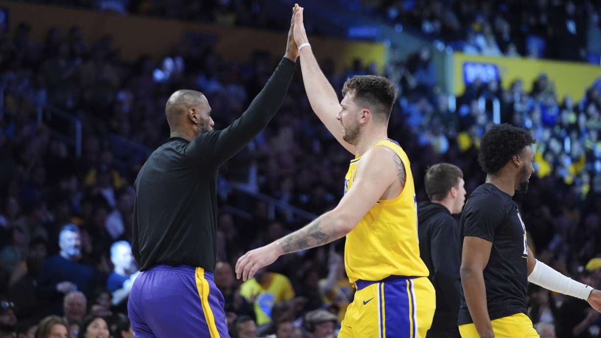 Los Angeles Lakers’ LeBron James, left, and Luka Doncic high-five during the first half of an NBA basketball game against the New Orleans Pelicans Tuesday, March 4, 2025, in Los Angeles. (AP Photo/Jae C. Hong)