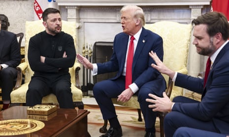 - European leaders have rallied behind Zelenskyy after the unprecedented exchange. The head of the European Commission, Ursula von der Leyen, and the European Council, Antonio Costa, were among the leaders who assured Zelenskyy of Europe’s support. “Today, it became clear that the free world needs a new leader,” said the EU’s top diplomat, Kaja Kallas. German chancellor Olaf Scholz said: “Ukraine can rely on Germany – and on Europe.” French president Emmanuel Macron said: “Russia is the aggressor and Ukraine is the aggressed people.” A spokesperson for UK prime minister Keir Starmer said: “He retains his unwavering support for Ukraine.”