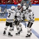 How the Broncos got here: Western Michigan dominated Denver over the first 40 minutes, holding a 2-0 lead and 32-8 shot advantage after two periods. The defending national champs wouldn’t go down without a fight, however, as the Pioneers controlled the third period and tied the game 2-2 with 2:39 to play in regulation. After a scoreless overtime, the Broncos struck 26 seconds into double OT, with Owen Michaels roofing his second goal of the game to win it.