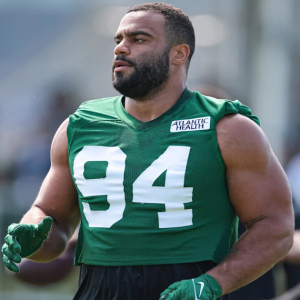 Jul 27, 2024; Florham Park, NJ, USA; New York Jets defensive end Solomon Thomas (94) warms up during training camp at Atlantic Health Jets Training Center. Mandatory Credit: Vincent Carchietta-Imagn…