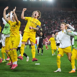 Bodo/Glimt players celebrate their qualification to the next phase after the end of the Europa League round of 16 second leg soccer match between Olympiacos FC and FK Bodo/Glimt at…