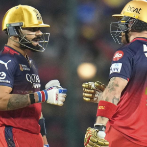 Royal Challengers Bengaluru’s Virat Kohli, left, and batting partner Phil Salt celebrate scoring runs during the Indian Premier League cricket match between Royal Challengers Bengaluru and Delhi Capitals at Chinnaswamy…