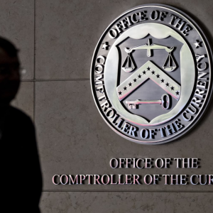 A pedestrian passes the seal of the Office of the Comptroller of the Currency displayed outside the organization’s headquarters in Washington, D.C., on March 20, 2019. The Office of the…