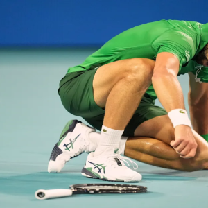 1 / 2 Novak Djokovic, of Serbia, gets up after collapsing on the court, as he plays Jakub Mensik, of Czech Republic, in the men’s singles final match at the…