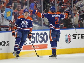 Edmonton Oilers Evan Bouchard (2) celebrates with Corey Perry (90) after Perry scores on the Los Angeles Kings during second-period NHL first-round playoff action on Sunday, April 27, 2025, in Edmonton. Photo by Greg Southam /Postmedia
