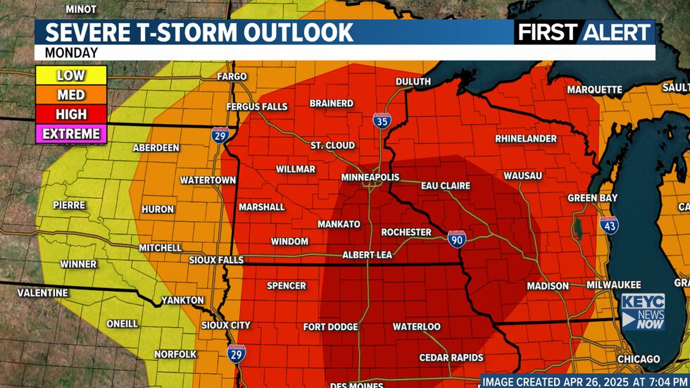 Storms may first develop early Monday across southern Minnesota and northern Iowa. More discrete, isolated supercells farther south could produce strong tornadoes. By late evening, a line of severe storms is expected to sweep east with widespread wind damage and embedded tornado threats.