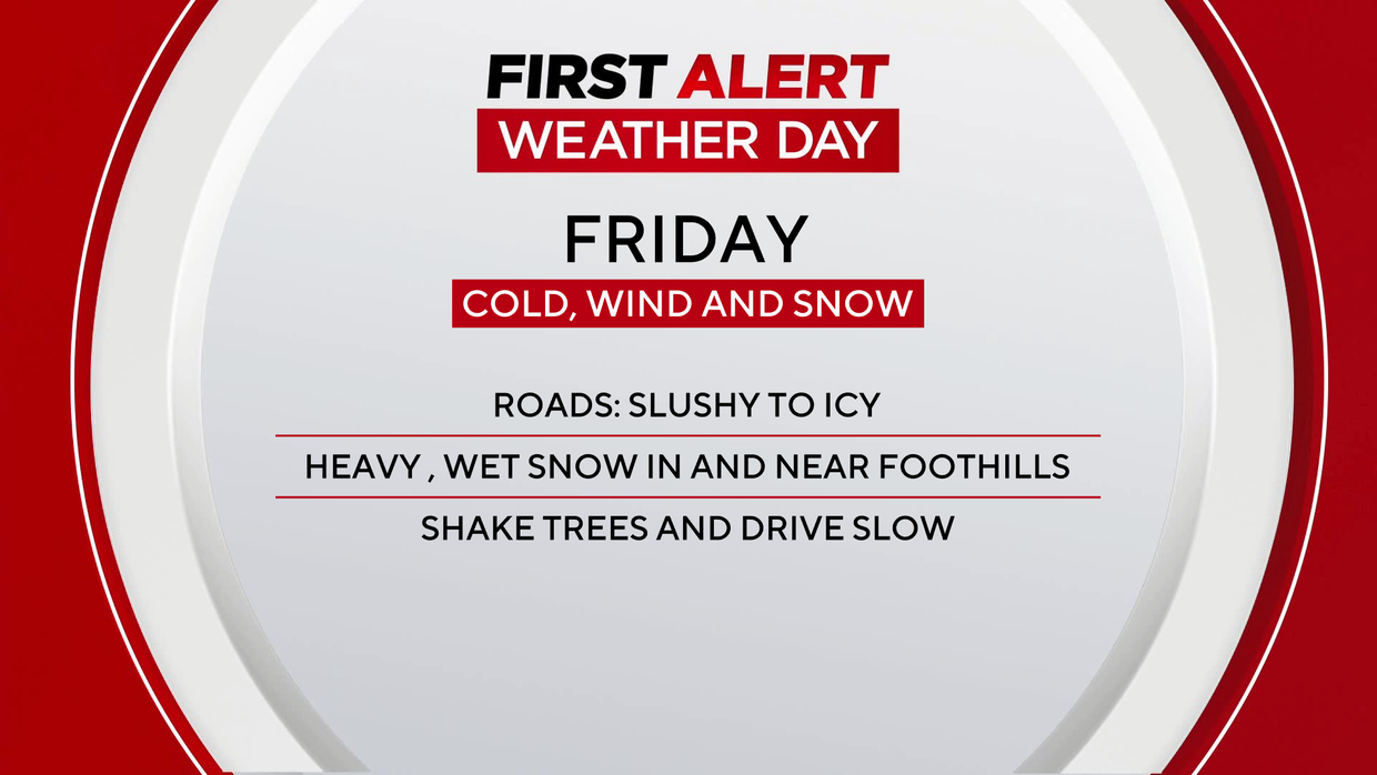 The snow will be heavy, wet and slushy. Roads will be wet to icy Friday morning and worse in the afternoon. Heavy snow could break branches in and near the foothills. Shake the trees to alleviate the weight of the snow and drive slow.