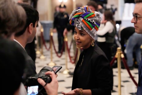 Rep. Ilhan Omar, D-Minn., speaks with reporters before President Donald Trump arrives to address a joint session of Congress. Photograph: Ben Curtis/AP