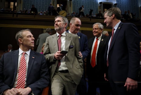 (from left to right) Representatives Scott Perry (R-PA), Thomas Massie (R-KY), Trent Kelly (R-MS), Ralph Norman (R-SC), and Brad Knott (R-NC) ahead of Donald Trump’s address to a joint session of Congress. Photograph: Win McNamee/Getty Images