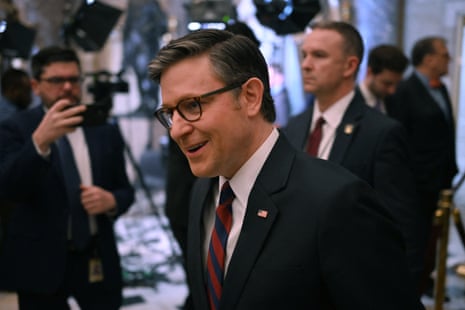 US Speaker of the House Mike Johnson arrives for President Donald Trump’s address to a joint session of Congress at the US Capitol. Photograph: Alex Wroblewski/AFP/Getty Images