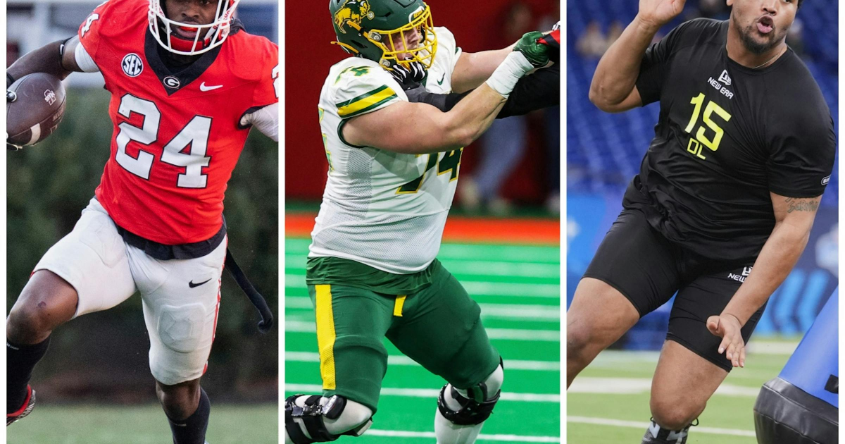 From left, Georgia safety Malaki Starks, North Dakota State offensive lineman Grey Zabel and Oregon defensive tackle Derrick Harmon are possible first-round picks for the Vikings. (The Associated Press)
